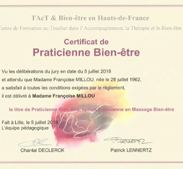 Françoise est diplômée depuis 2018 d'un centre de formation Lillois spécialisé dans l'accompagnement au bien-être.